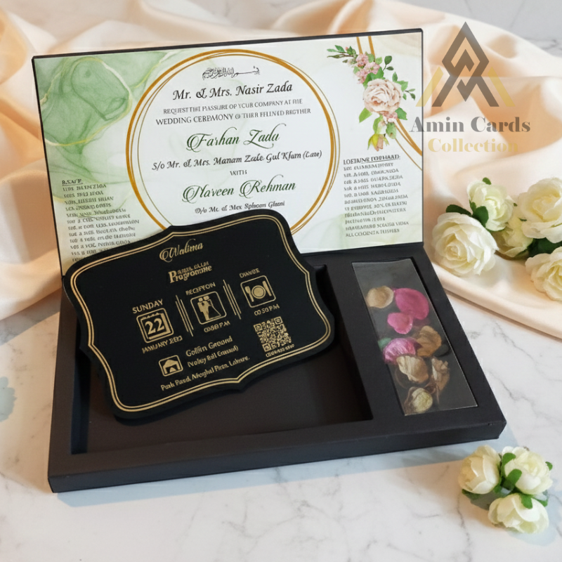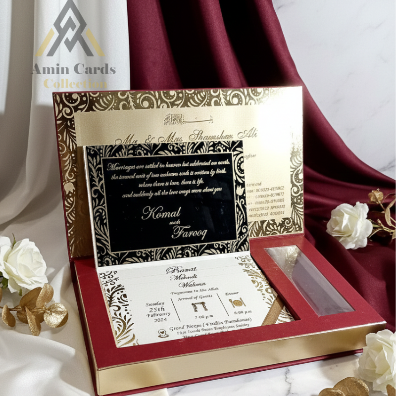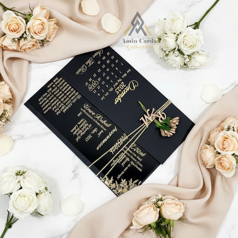Unique Black Acrylic Card: The main invitation is engraved on a thick black acrylic sheet with contrasting gold text (e.g., Komal weds Farooq).