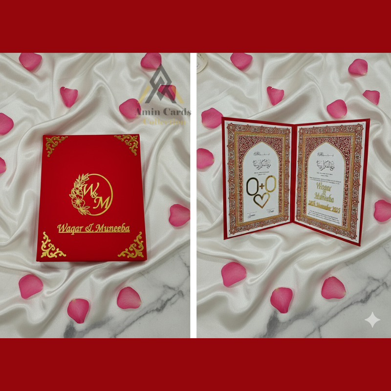 Four-Piece Luxury Set: Includes a Red & Gold Hard Box, a Black Acrylic Laser-Cut Main Card, a Multi-Event Card Insert, and a Presentation Window with dried florals.