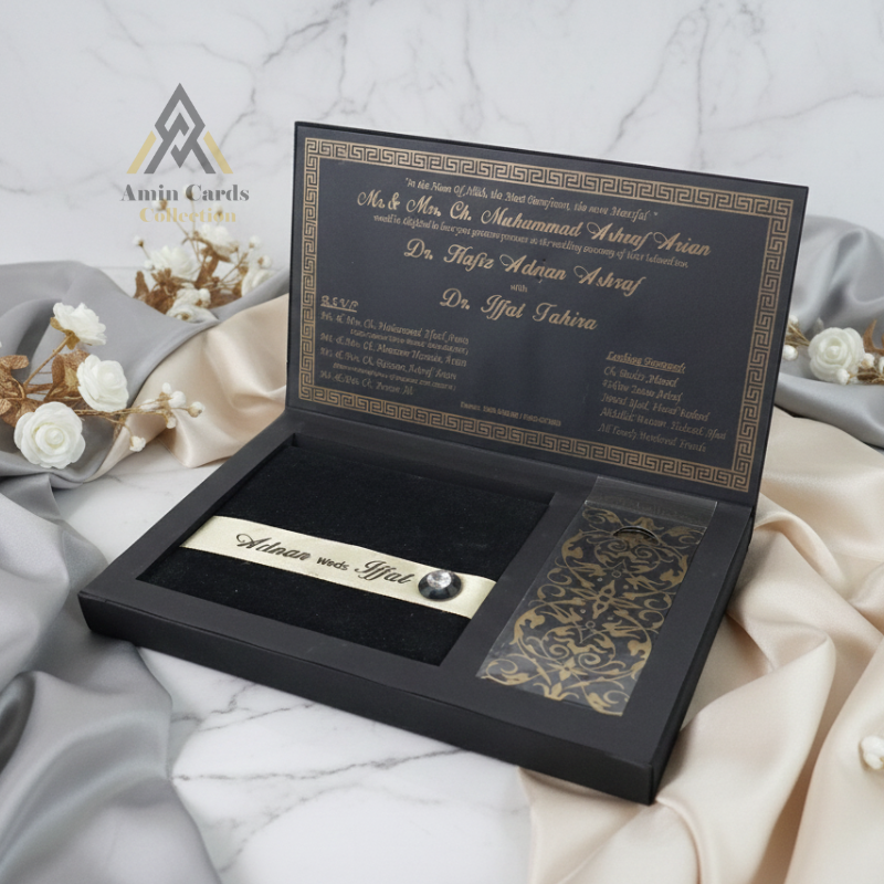 Velvet Main Card Display: Features a unique black velvet card insert with personalized names (e.g., Adnan weds Iffat) printed on a gold band.
