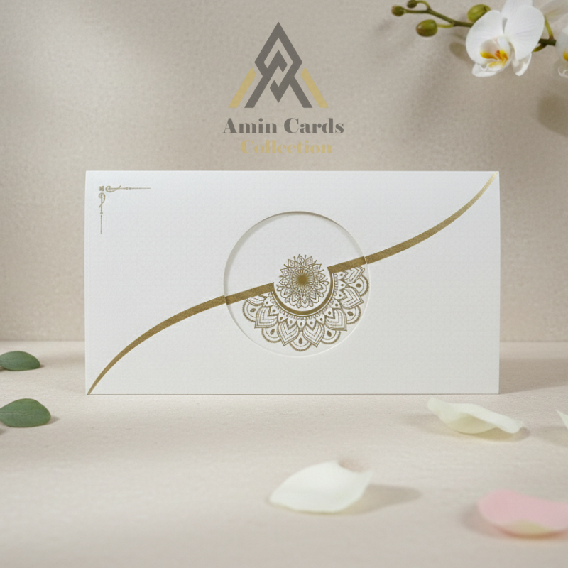 Intricate Gold Mandala/Floral Die-Cut: The central circular cutout reveals the inner design or text, adding depth and visual interest.