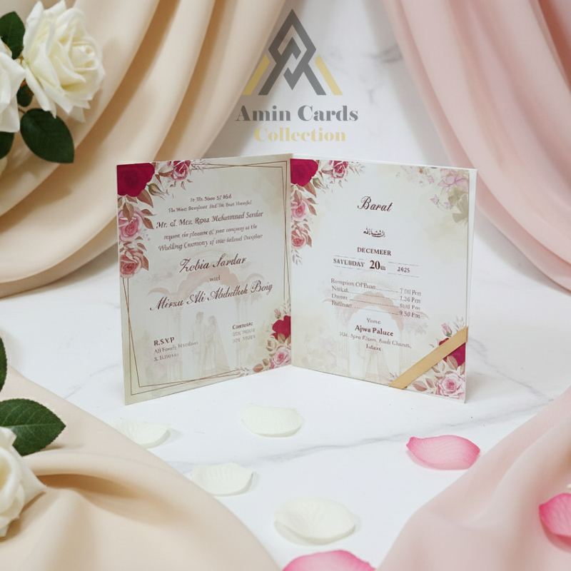 Multi-Event Cards: Includes a main card for the wedding details (e.g., Zohan Irfan weds Bisma Ali) and a separate card for the Baraat / Walima events.
