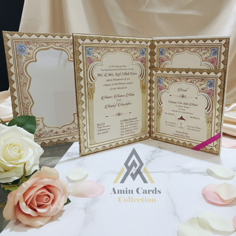 Two-Piece Luxury Set: Includes a Hard Box Invitation with a decorative window arch and a Box Insert holding the main card.