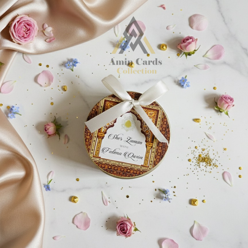 This beautifully designed Round Sweet Tin provides a premium and traditional way to present mithai, dry fruits, or confectionery at your wedding, Nikkah, or special celebration. The tin features a rich brown and gold damask pattern, giving it a luxurious, royal heritage aesthetic.