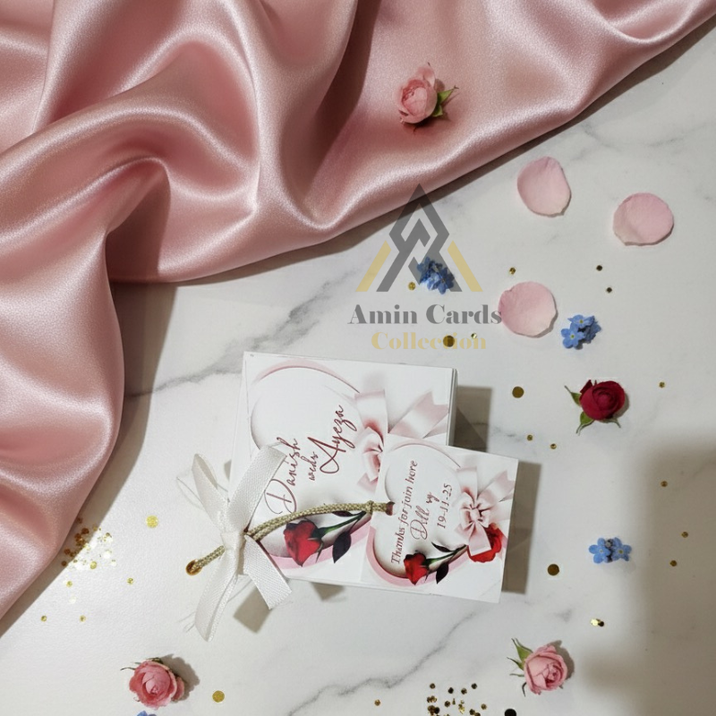 Personalized Hanging Tag: Includes custom details like "Nikkah Mubarak," the couple's names (e.g., Ch. Abdul Rehman), and the date (08.11.2025).