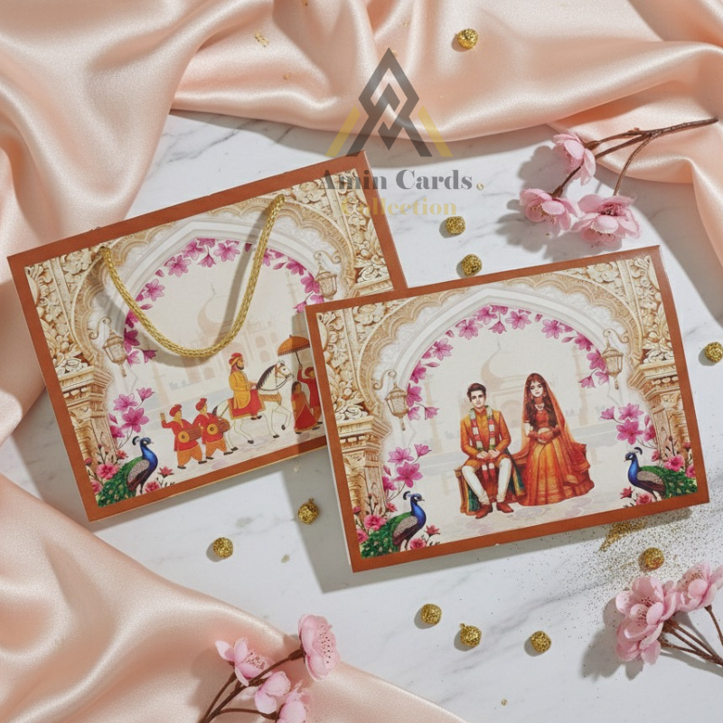 This magnificent Wedding Invitation Set is designed for couples who desire a deeply traditional and royal look for their wedding announcements. The set features a rich illustration inspired by Mughal and South Asian heritage, perfect for the Baraat or Shaadi event.