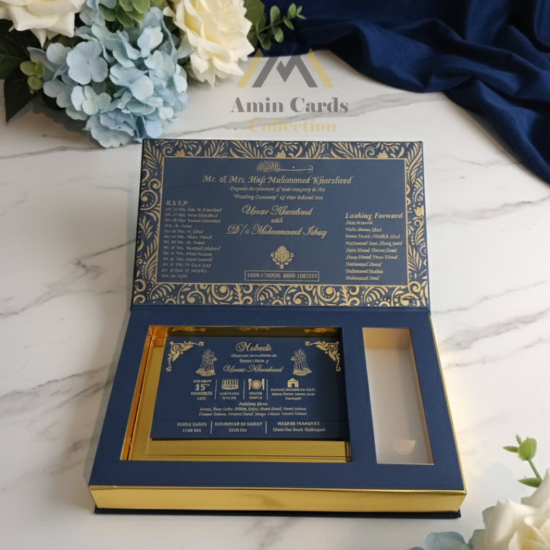 Acrylic Card: The main invitation is a high-quality Dark Blue Acrylic Card engraved with gold text and a modern geometric frame.