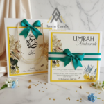 A beautifully designed Umrah Mubarak gift box, perfect for presenting duas, tasbeeh, dates, or small gifts. Elegant floral theme with ribbon finishing. Ideal for Umrah celebrations and gifting loved ones.